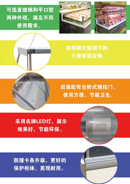 冷柜運行溫度M1(-1~5℃)時(shí),用于展示和銷(xiāo)售各種肉類(lèi)、水果、熟食、乳品及冷飲等。熱柜運行溫度60~65℃時(shí),干熱柜用于展示和銷(xiāo)售各種烤、熏、煎、炸等熟食;濕熱柜用于展示和銷(xiāo)售成品熱菜、蒸煮食品、肉制品等。